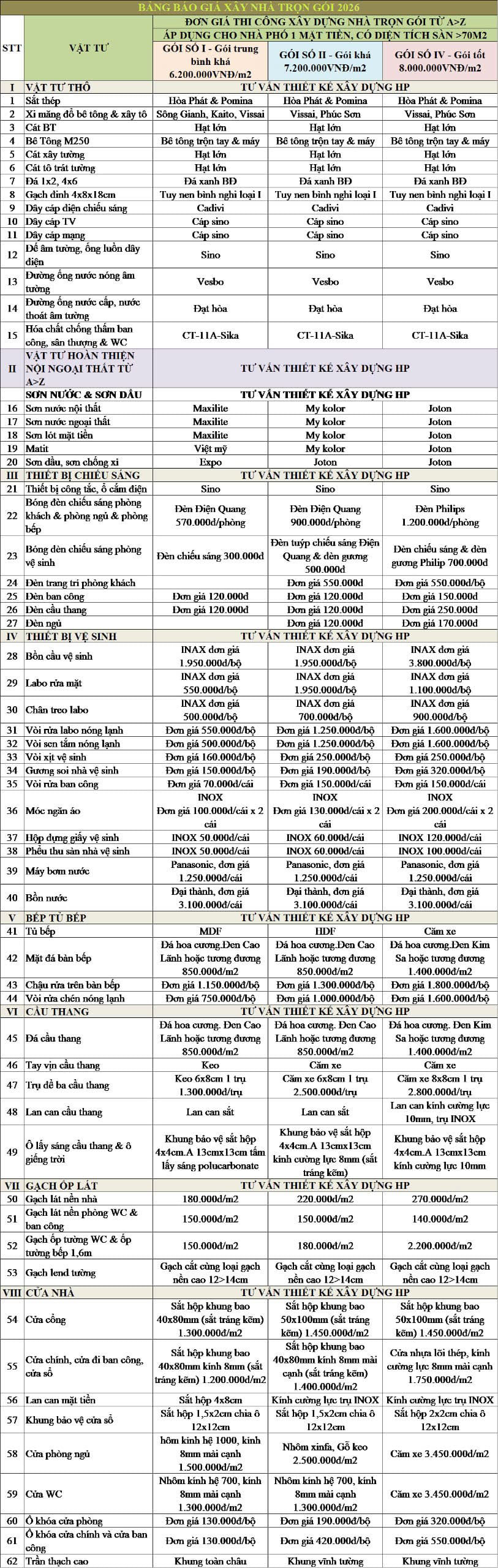 Bảng báo giá xây nhà trọn gói theo vật tư 2026