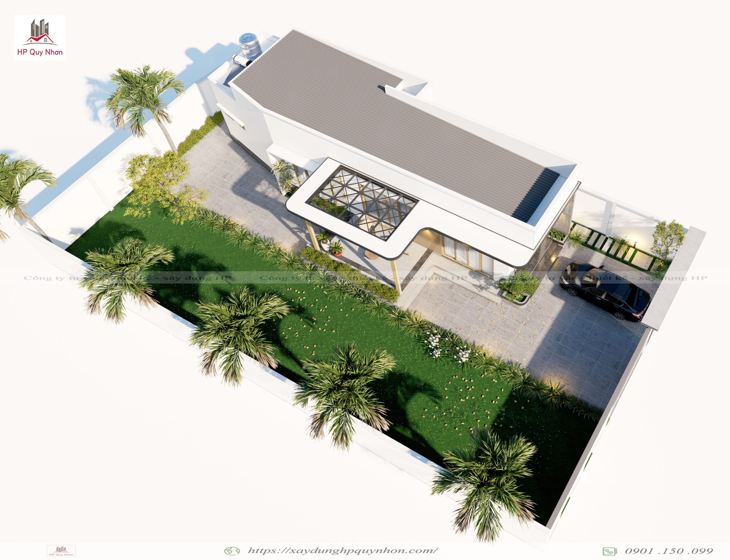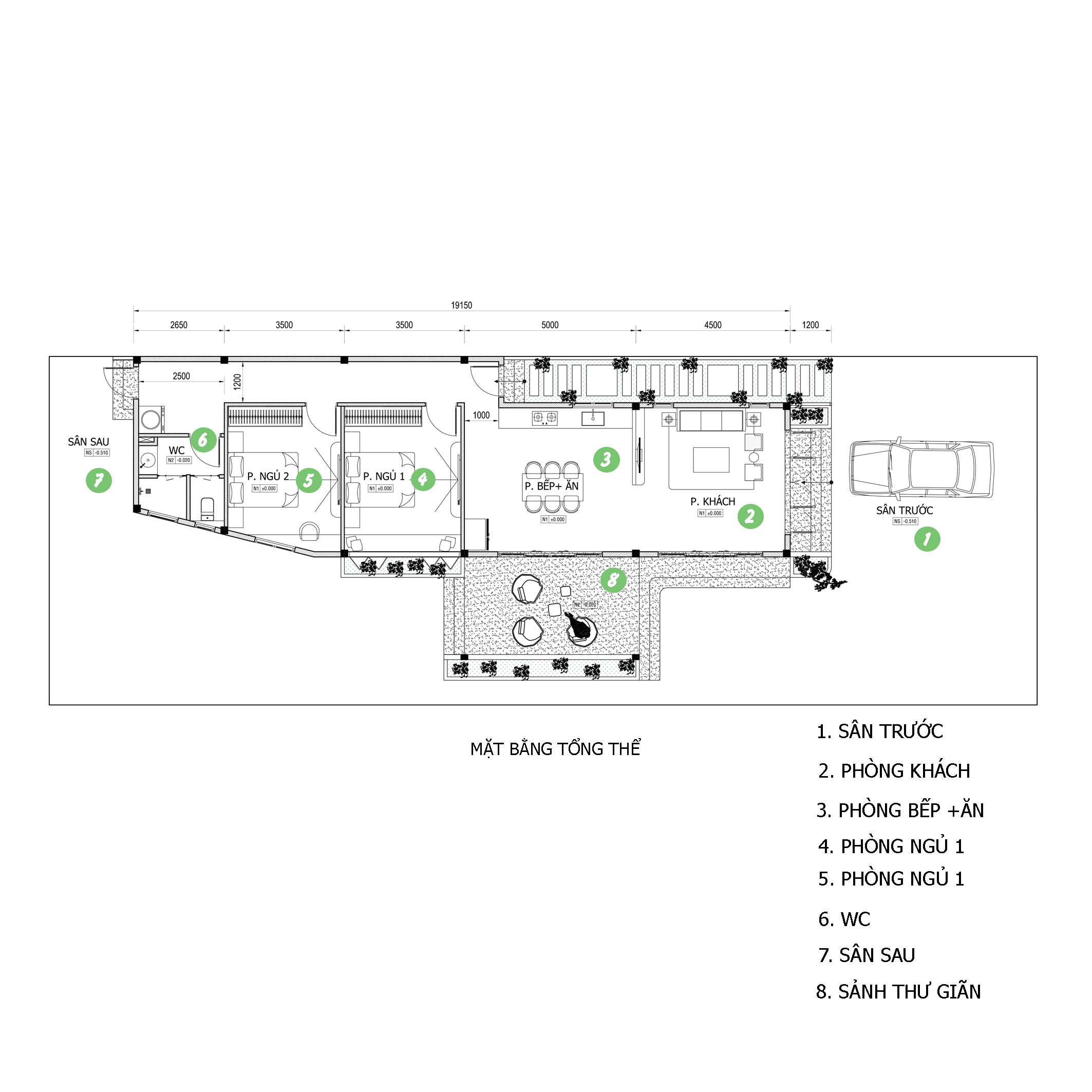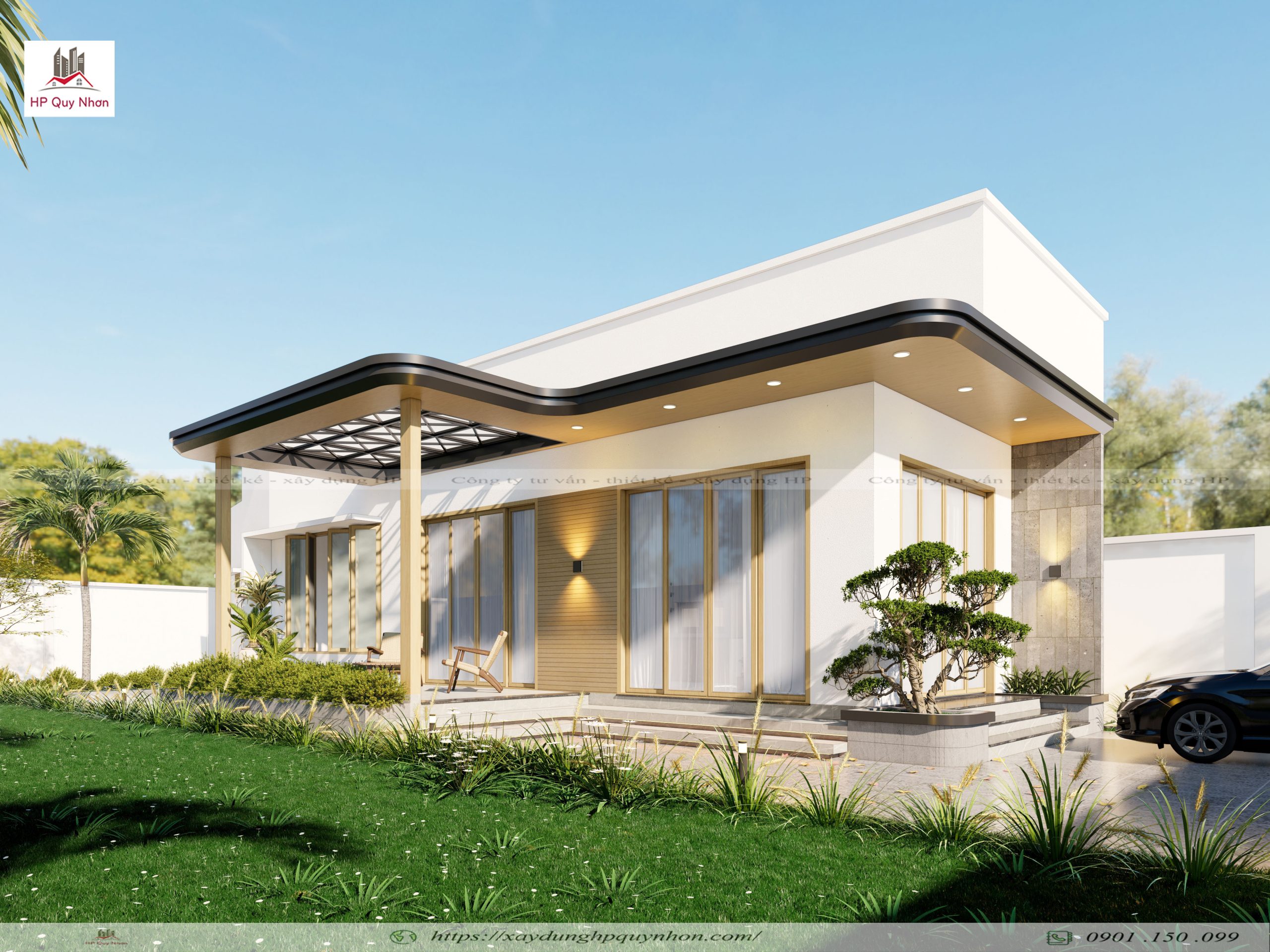 Không gian phòng khách được đặt ở vị trí trung tâm, kết nối trực tiếp với sân vườn phía trước, tạo cảm giác rộng rãi và tràn ngập ánh sáng tự nhiên. Khu bếp và bàn ăn được thiết kế liền kề nhưng vẫn tách biệt nhẹ bằng vách gỗ hoặc kệ trang trí, giúp không gian sinh hoạt chung thêm ấm cúng, tiện lợi. Hai phòng ngủ với diện tích vừa đủ , đảm bảo riêng tư và thoáng mát nhờ hệ thống cửa sổ mở ra vườn cây xanh. Nhà vệ sinh được thiết kế gọn gàng, sạch sẽ, sử dụng vật liệu hiện đại và dễ vệ sinh.