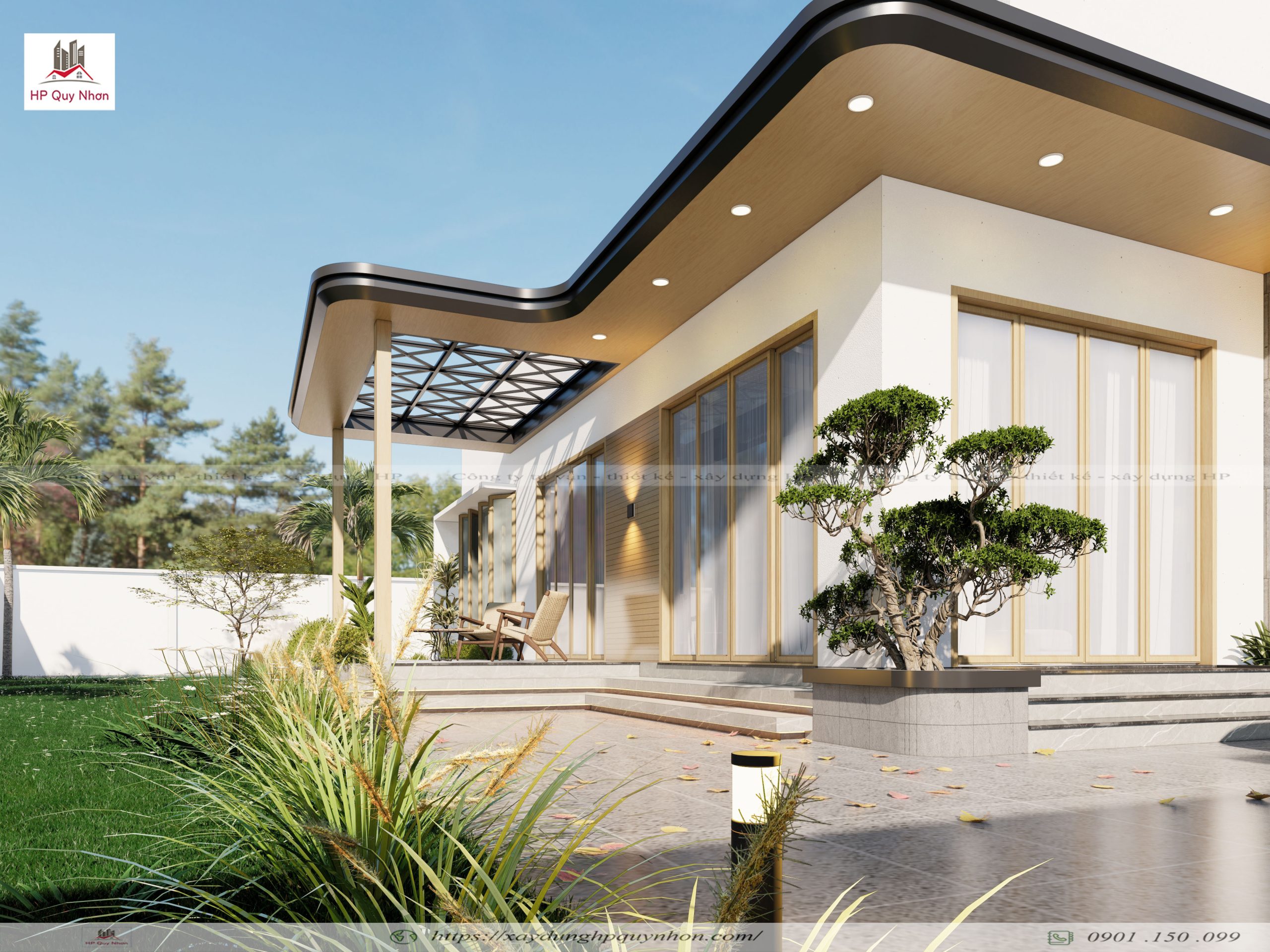 Không gian phòng khách được đặt ở vị trí trung tâm, kết nối trực tiếp với sân vườn phía trước, tạo cảm giác rộng rãi và tràn ngập ánh sáng tự nhiên. Khu bếp và bàn ăn được thiết kế liền kề nhưng vẫn tách biệt nhẹ bằng vách gỗ hoặc kệ trang trí, giúp không gian sinh hoạt chung thêm ấm cúng, tiện lợi. Hai phòng ngủ với diện tích vừa đủ , đảm bảo riêng tư và thoáng mát nhờ hệ thống cửa sổ mở ra vườn cây xanh. Nhà vệ sinh được thiết kế gọn gàng, sạch sẽ, sử dụng vật liệu hiện đại và dễ vệ sinh.